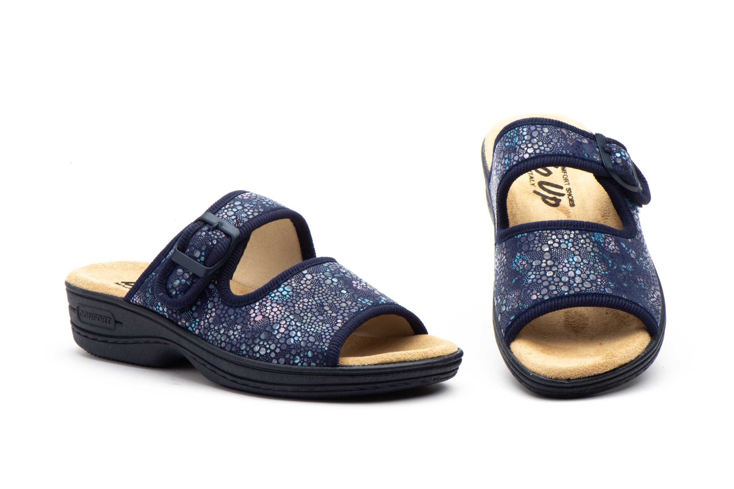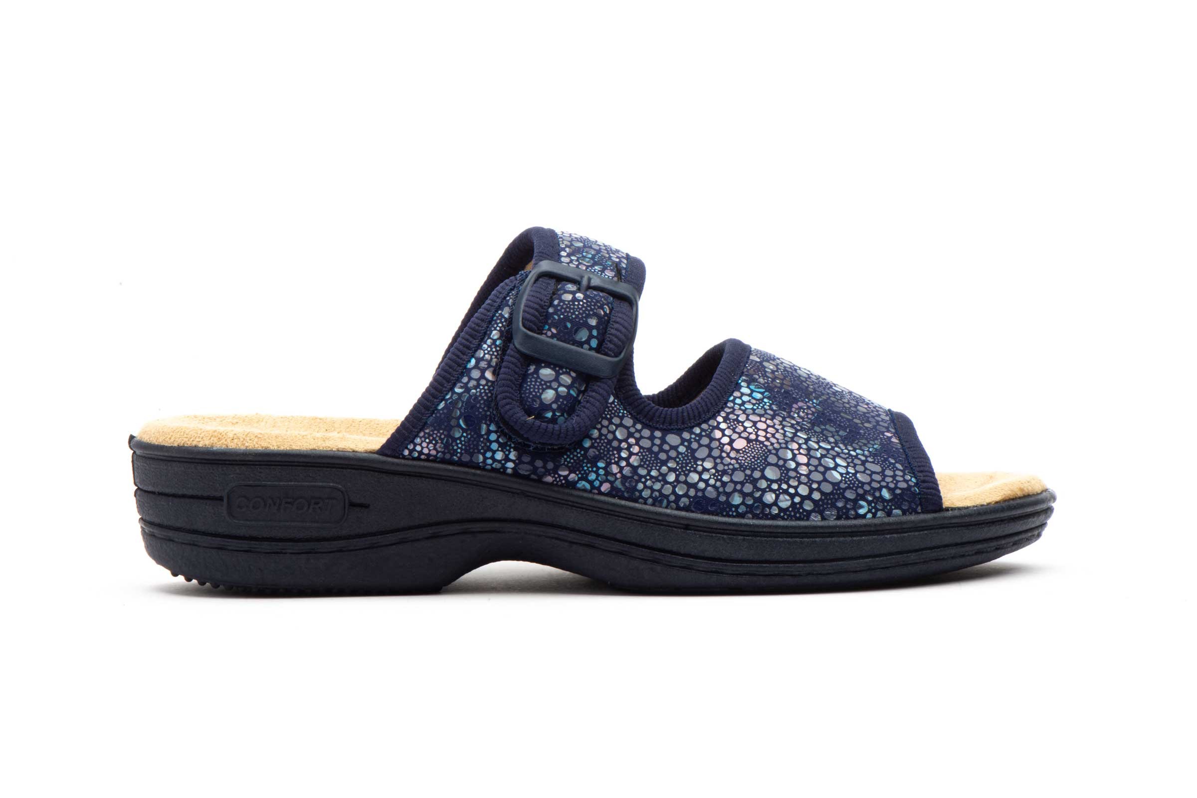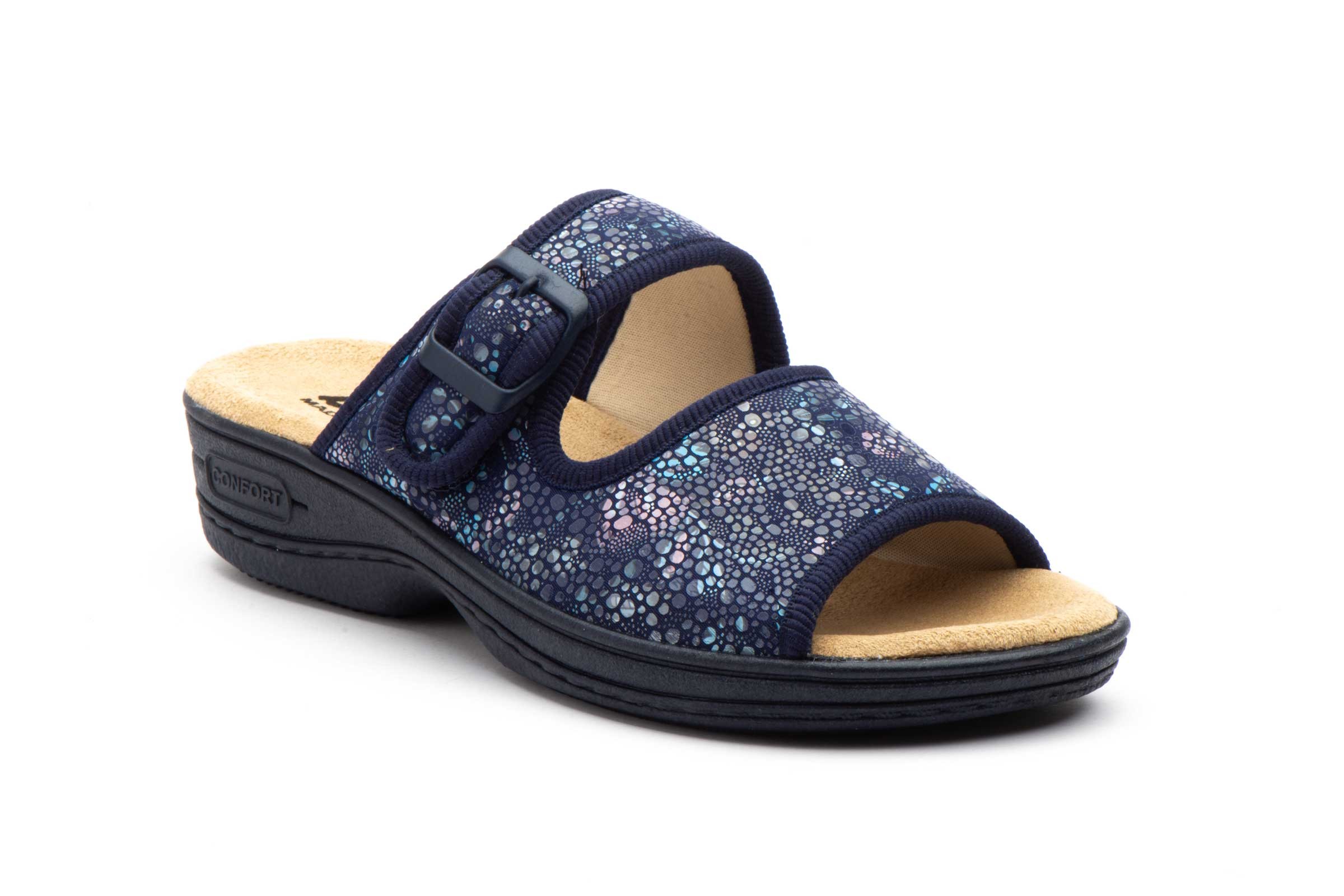 Estos **zuecos** para mujer en color **marino** son el complemento perfecto para cualquier outfit casual. Con cierre de **velcro** para mayor comodidad y ajuste, son ideales para el día a día.