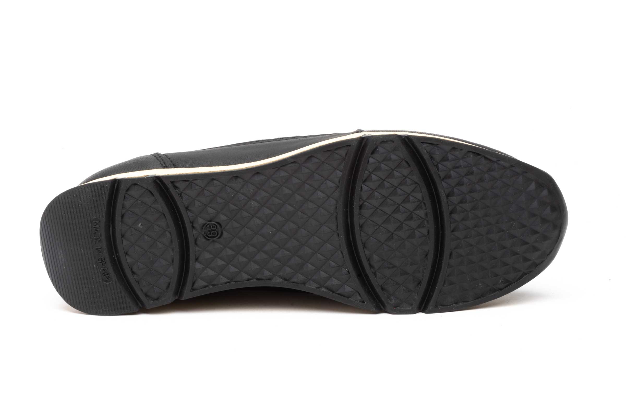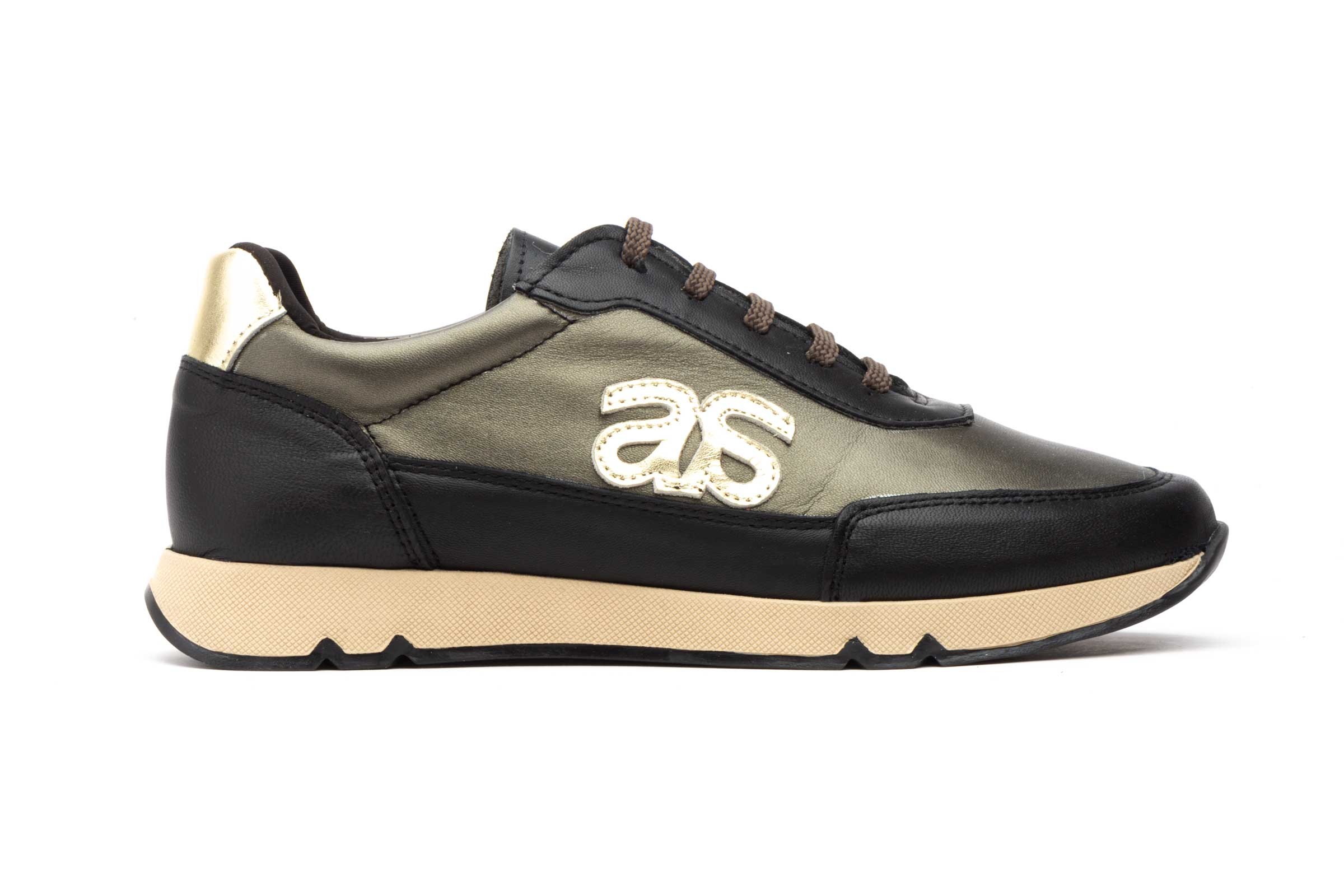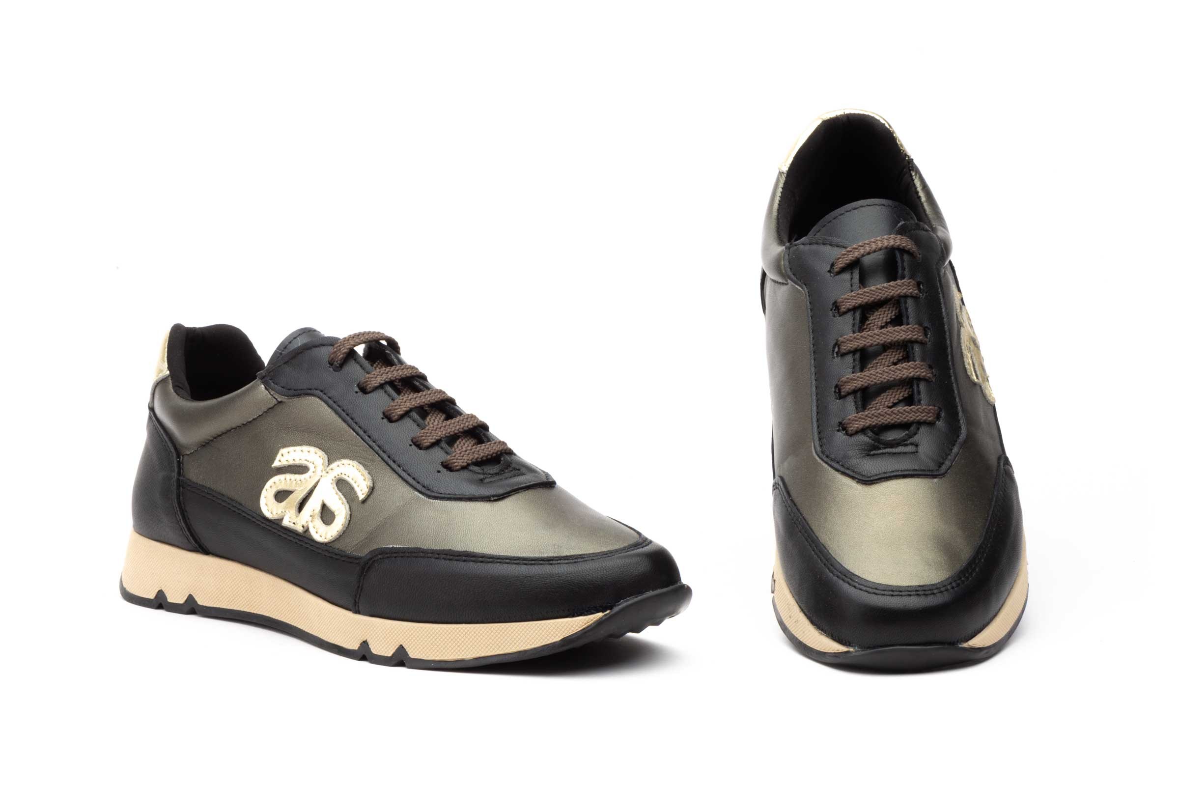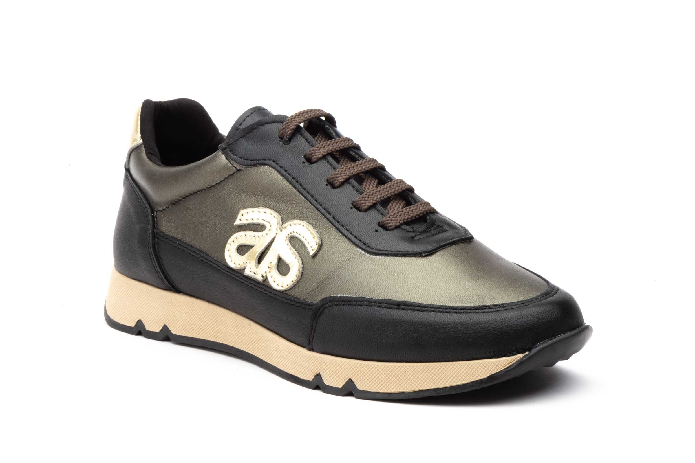 Estos deportivos de mujer en piel negro son el complemento perfecto para un look casual y moderno. Con detalles metálicos que le dan un toque sofisticado, son ideales para combinar con jeans o leggings.